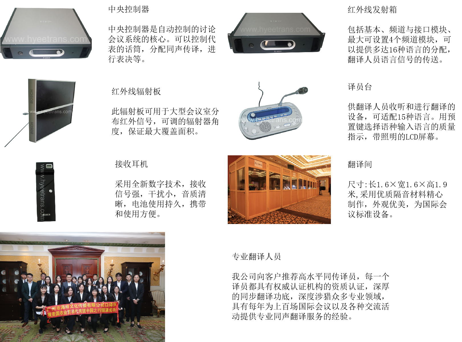 Star-Meeting会议服务公司对于这一领域的严格要求,已经远远超越了对横向其它服务内容的关注。作为专业的公关会议活动服务机构,Star-Meeting会议服务公司所用的同声传译设备全部为德国博世公司所生产的产品,质量可靠,声音清晰,没有任何杂音,且采取无线接收。同时,在翻译人员方面,也可以满足英语、日语、法语、德语、俄语等各语种的外语翻译并覆盖几十种专业领域。高水平的同传译员,高质量的同传设备,再加上音响、视频等设备,共同成为我们高质量服务的基础保障。